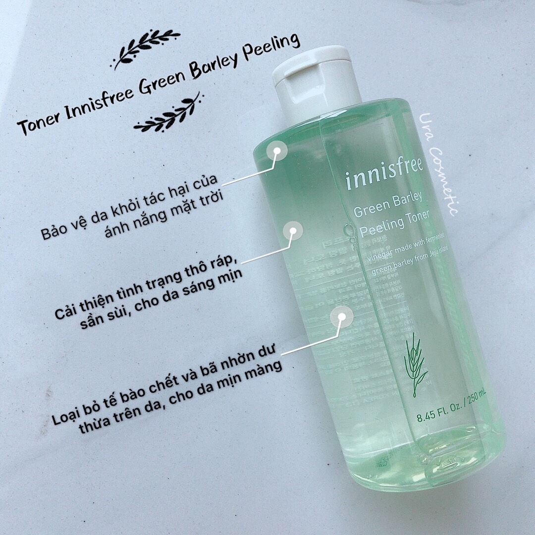 – Innisfree Green Barley Peeling Toner chứa thành phần tẩy da chết tự nhiên từ lúa mạch xanh lên men và chiết xuất từ vỏ cây liễu trắng nhẹ nhàng loại bỏ tế bào da chết và bã nhờn dư thừa trên bề mặt da mang lại cho bạn làn da mịn màng, tươi mát.