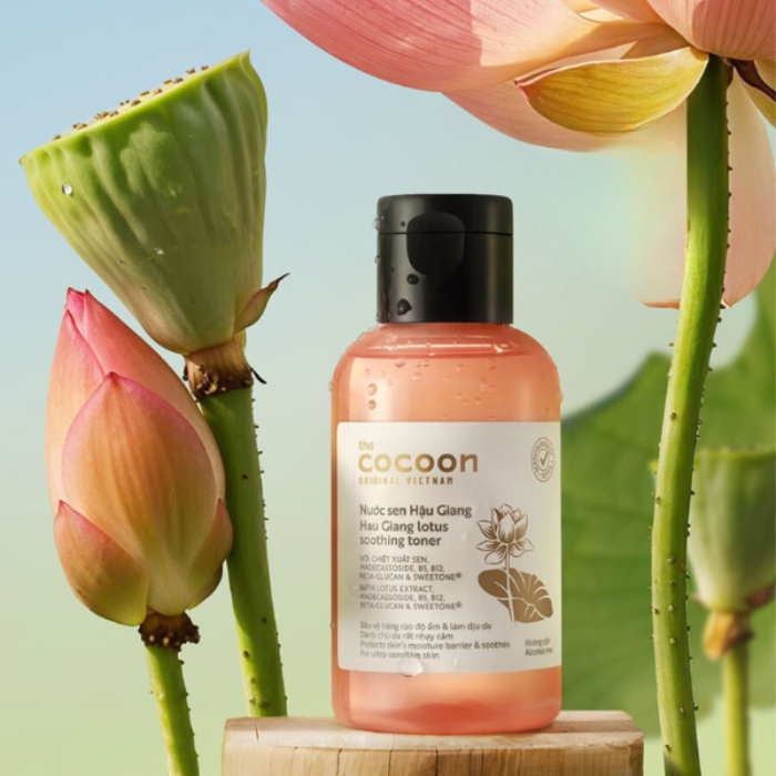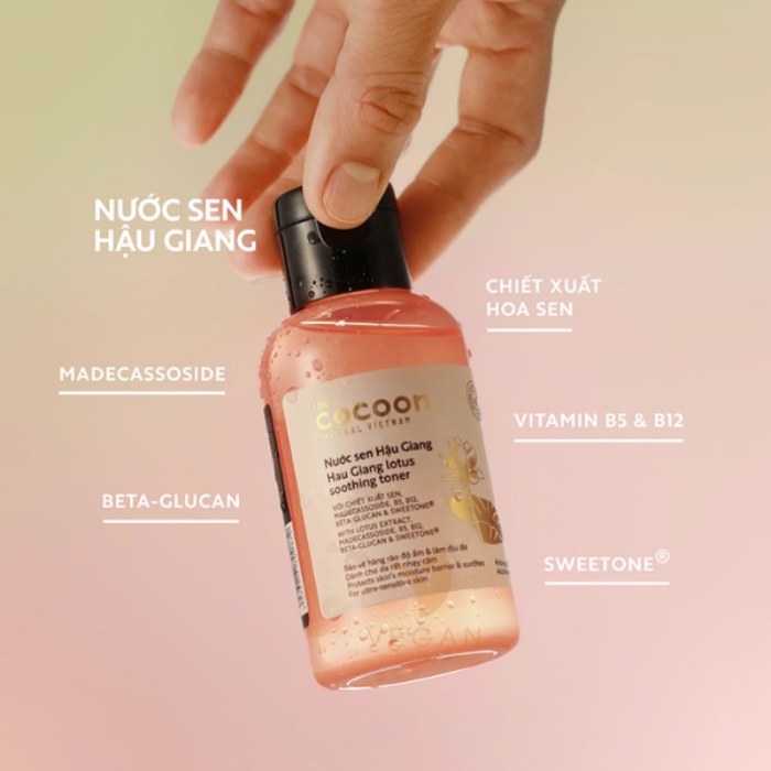 Nước Hoa Hồng Sen Cocoon Hau Giang Lotus Soothing Toner Làm Dịu Da là sản phẩm toner với sự kết hợp từ những đóa sen từ vùng đất Hậu Giang cùng các hoạt chất gồm Madecassoside, vitamin B5, B12, Beta-glucan (prebiotic) ... nước cân bằng giúp bảo vệ hàng rào độ ẩm của làn da nhạy cảm, hỗ trợ và cải thiện da mẩn đỏ, kích ứng, mang lại cảm giác nhẹ nhàng, ẩm mượt.