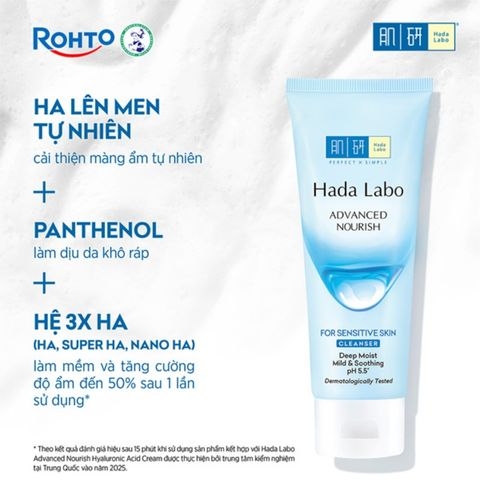 Gel Rửa Mặt Hada Labo Dưỡng Ẩm Cho Da Nhạy Cảm Advanced Nourish For Sensitive 80g là sản phẩm sữa rửa mặt đến từ thương hiệu Hada LaBo của Nhật Bản. Sữa rửa mặt với hệ dưỡng 4 loại HA kết hợp Panthenol giúp làm dịu và bảo vệ da khỏi 5 dấu hiệu nhạy cảm: màng ẩm suy yếu, da khô, da thô ráp, da dễ kích ứng, da căng. Hada Labo Advanced Nourish For Sensitive Skin Cleanser giúp làm sạch sâu bụi bẩn, vi khuẩn, bã nhờn, các tạp chất và tế bào chết trên da mà da vẩn đủ ẩm, không khô căng khi rửa mặt.