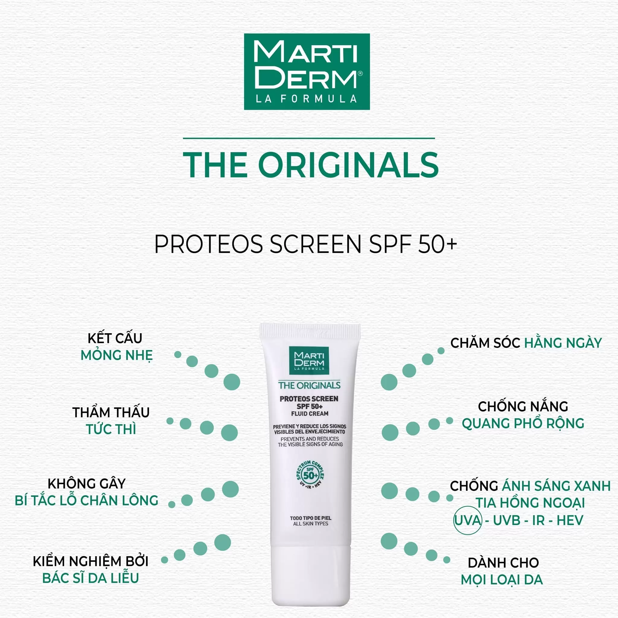 Kem Chống Nắng MartiDerm The Originals Proteos Screen SPF50+ Fluid Cream là một sản phẩm chống nắng đa năng, dễ sử dụng và có tính thẩm mỹ cao, lý tưởng dành cho mọi loại da khi sử dụng hằng ngày nhờ các ưu điểm tuyệt vời sau: