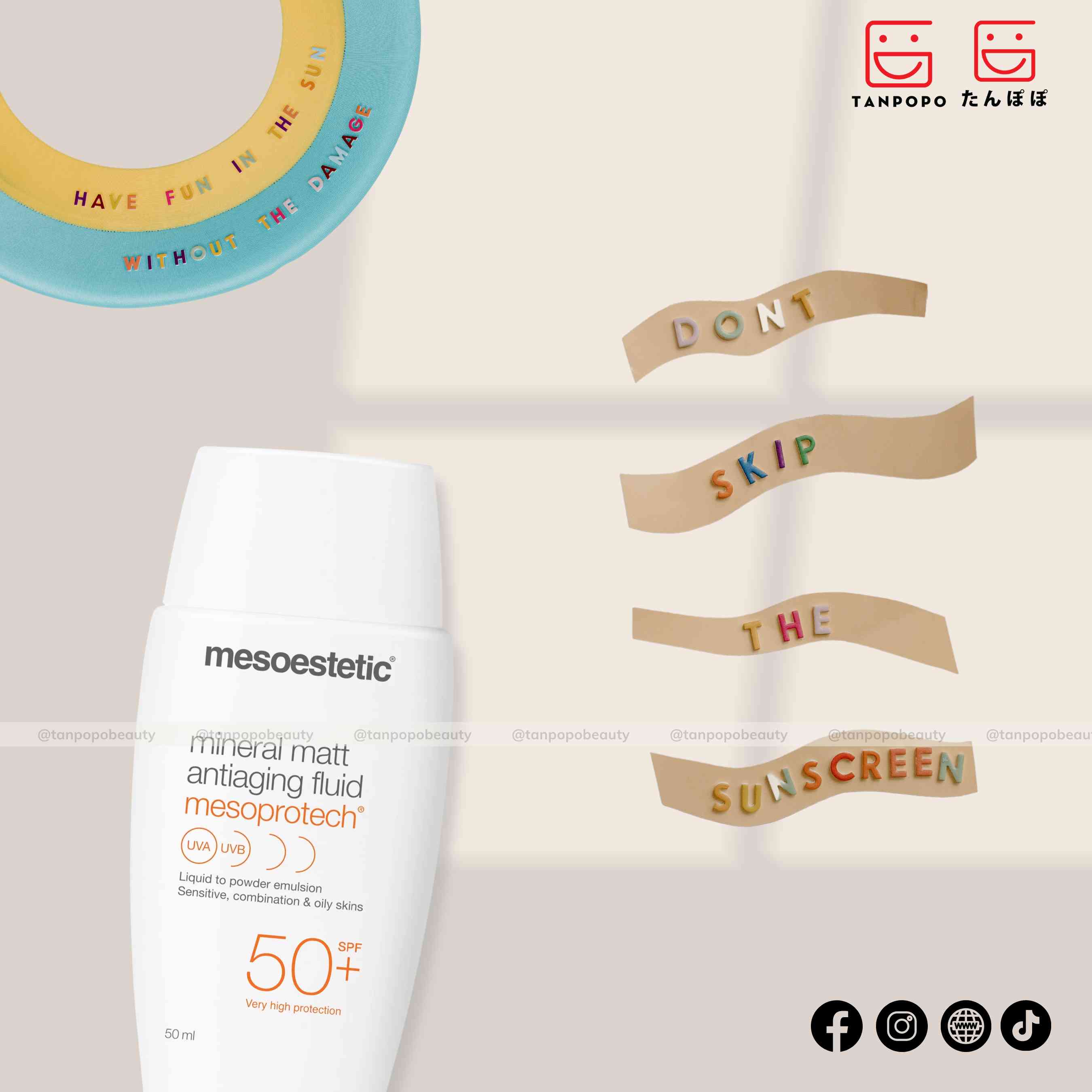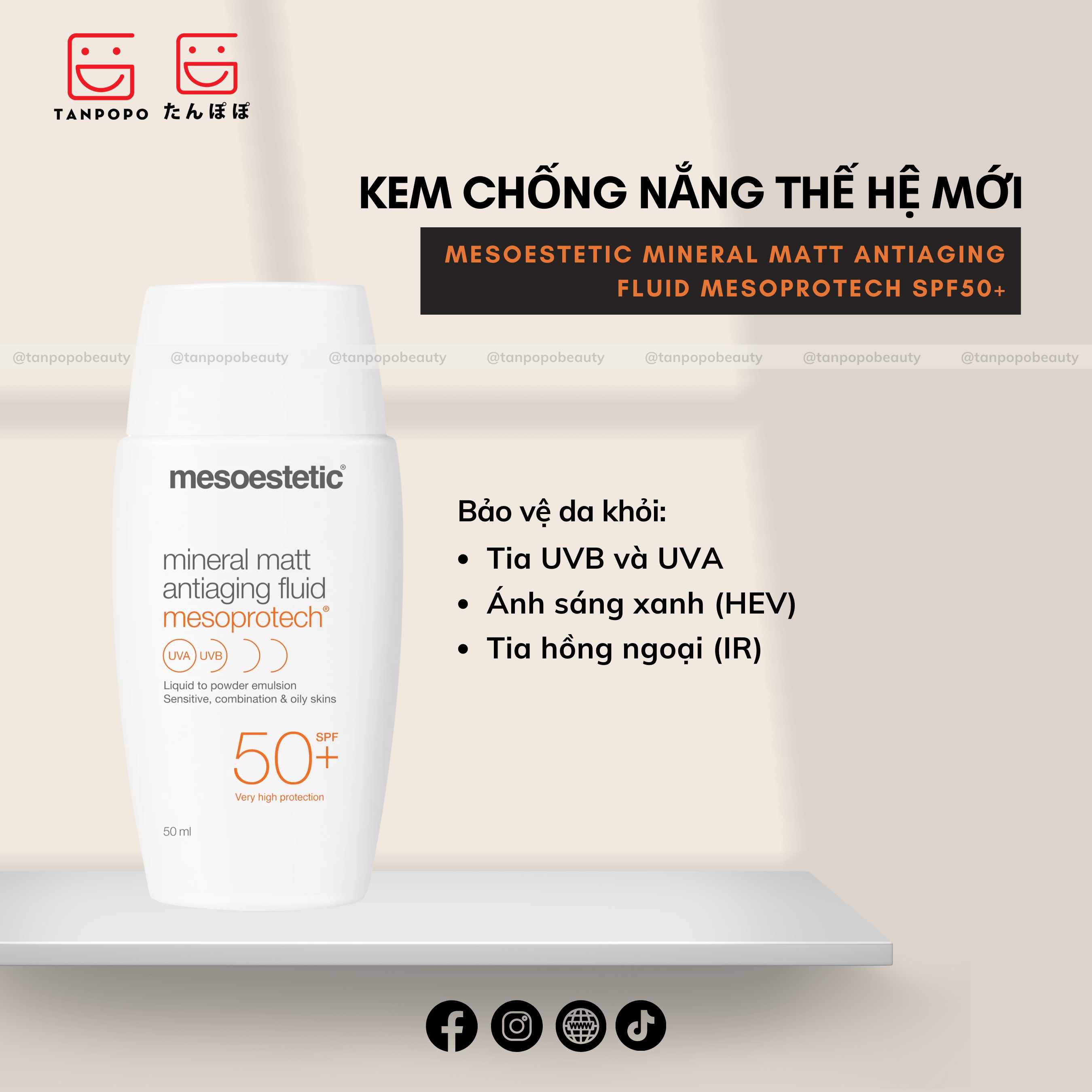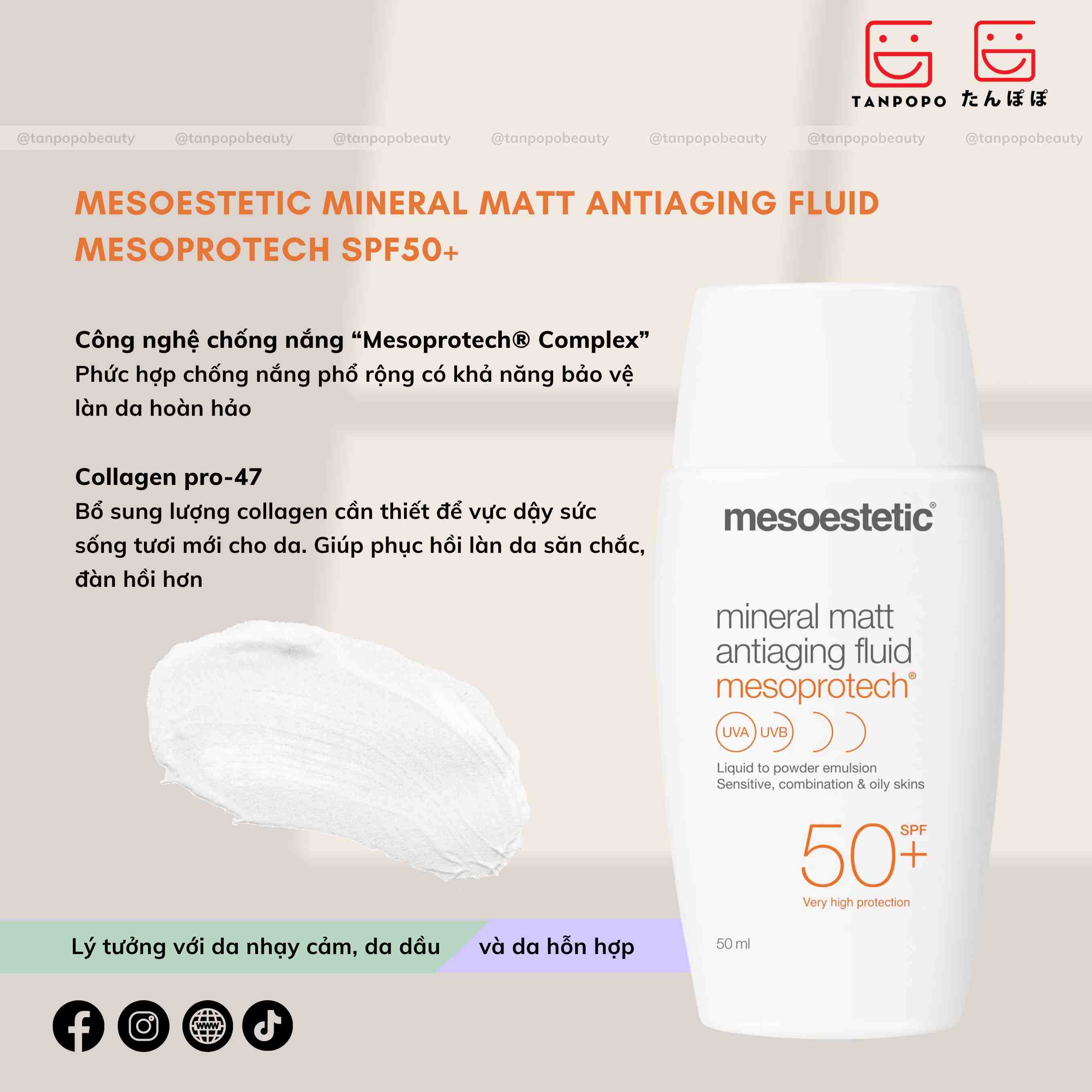 Kem Chống Nắng Mesoestetic Mineral Matt Antiaging Fluid Mesoprotech SPF50+ 50ml là dòng kem chống nắng cao cấp chống thấm nước, không gây mụn. Với khả năng bảo vệ da trước các tác động từ tia UVA/UVB, ánh sáng nhin thấy được và cả bức xạ tia hồng ngoại từ thiết bị điện tử. Giúp ngăn ngừa da sạm nám, dưỡng da sáng mịn đều màu và chống lão hóa da mạnh mẽ.