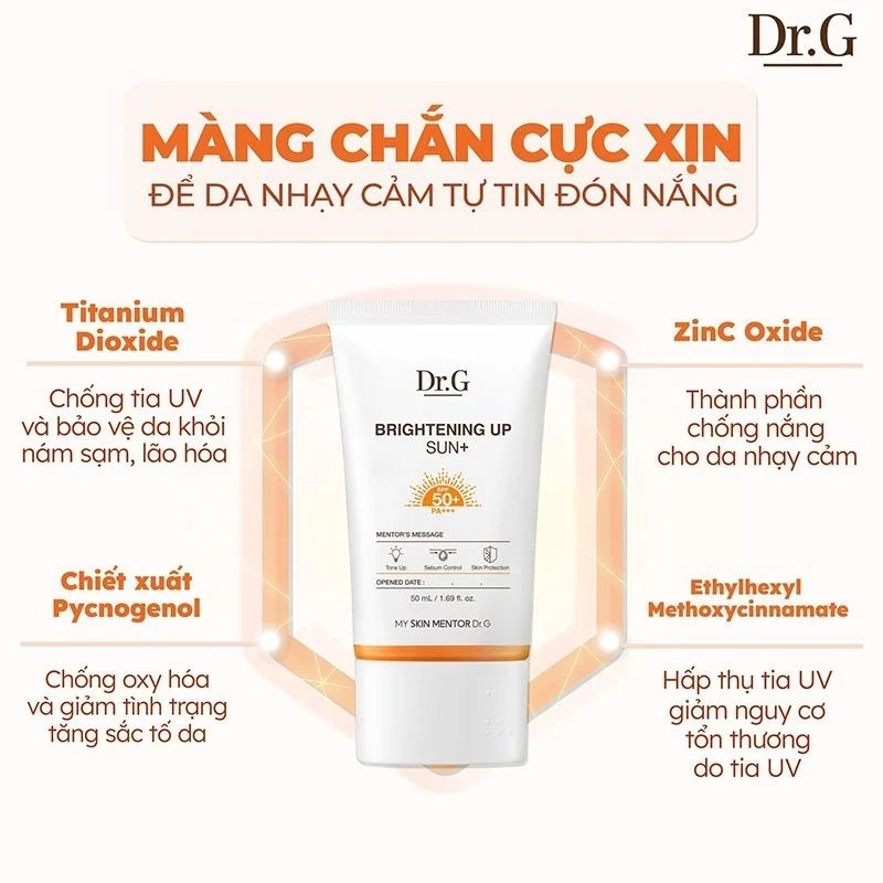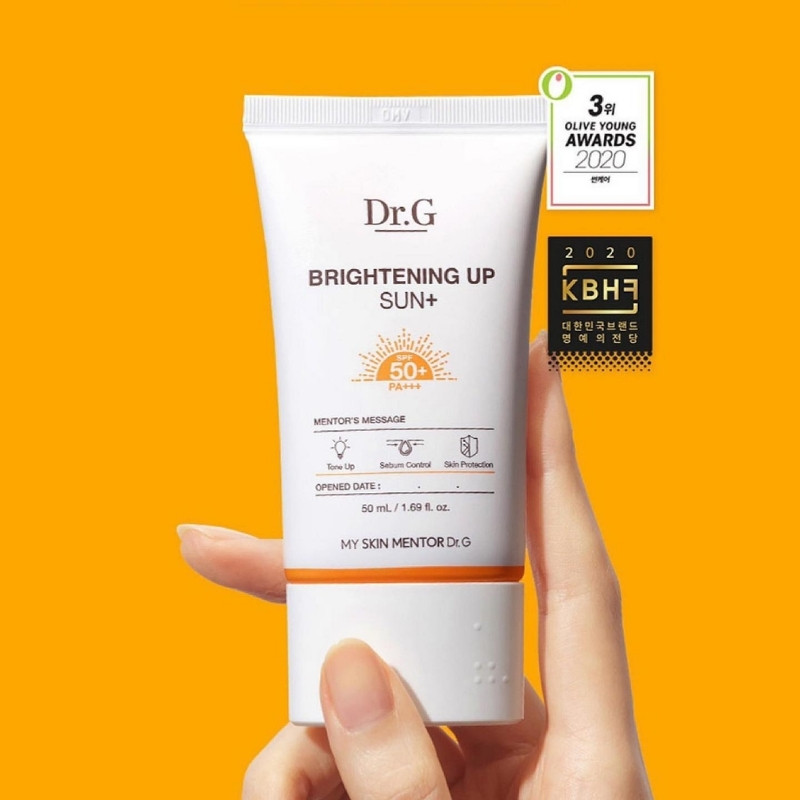 - Kem Chống Nắng Dưỡng Sáng Nâng Tone Da Dr.G Brightening Up Sun+ có thể sử dụng như kem nền bởi khả năng nâng tông tự nhiên cùng khả năng kiềm dầu tốt, cho bạn lớp nền mỏng nhẹ.