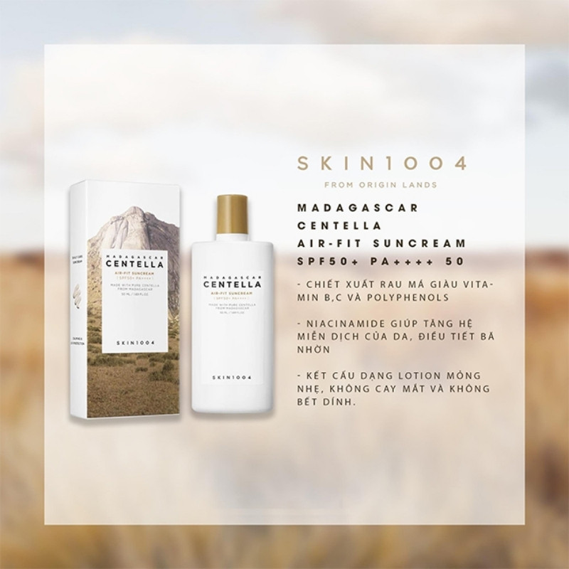 Kem Chống Nắng Skin1004 Cho Da Nhạy Cảm Madagascar Centella Air-Fit là dòng kem chống nắng mới đến từ thương hiệu mỹ phẩm Skin1004, với công thức chứa thêm 20% chiết xuất rau má giúp làm dịu và củng cố hàng rào bảo vệ da. Ngoài ra có chứa các thành phần từ thực vật giúp bảo vệ da tránh các tác động xấu từ môi trường.