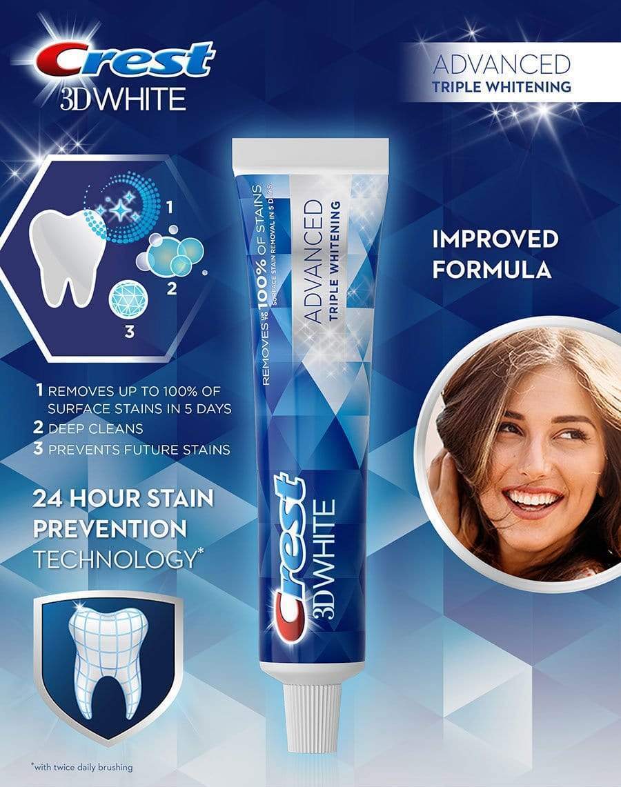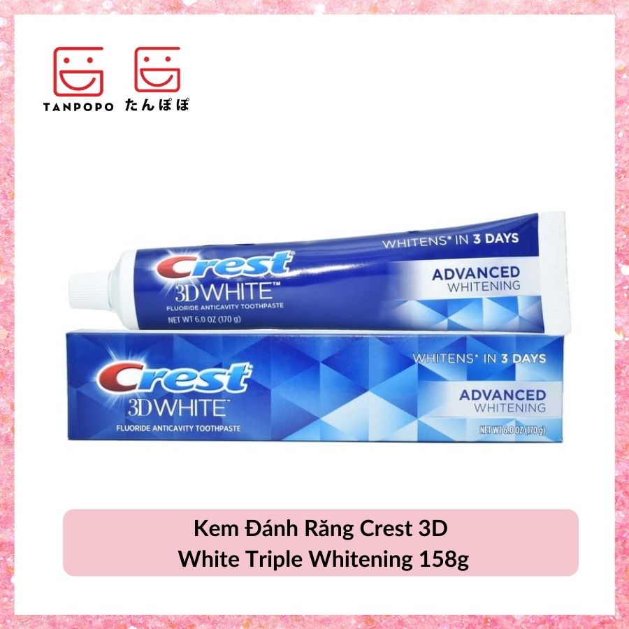 - Dòng Kem Đánh Răng Crest 3D White Triple Whitening 158g là phiên bản nâng cấp dòng Crest 3D White Advanced, Công nghệ làm trắng vượt trội gấp 3 lần so với các dòng Crest 3D White khác