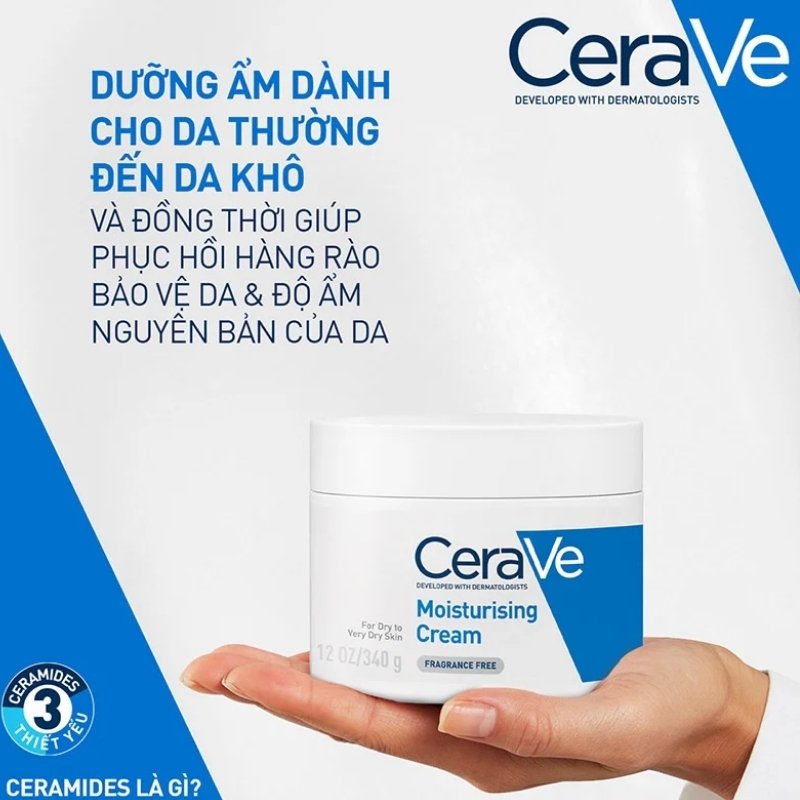 Kem Dưỡng Ẩm Dành Cho Da Khô Cerave Developed With Dermatologists Moisturising Cream với công thức chứa Ceramides thiết yếu và Hyaluronic acid giúp dưỡng ẩm và hỗ trợ phục hồi hàng rào bảo vệ tự nhiên của da suốt 24h, ngừa tinh trạng mất nước, tổn thương, khô ráp của da, giúp da luôn ẩm mịn, mềm mại.