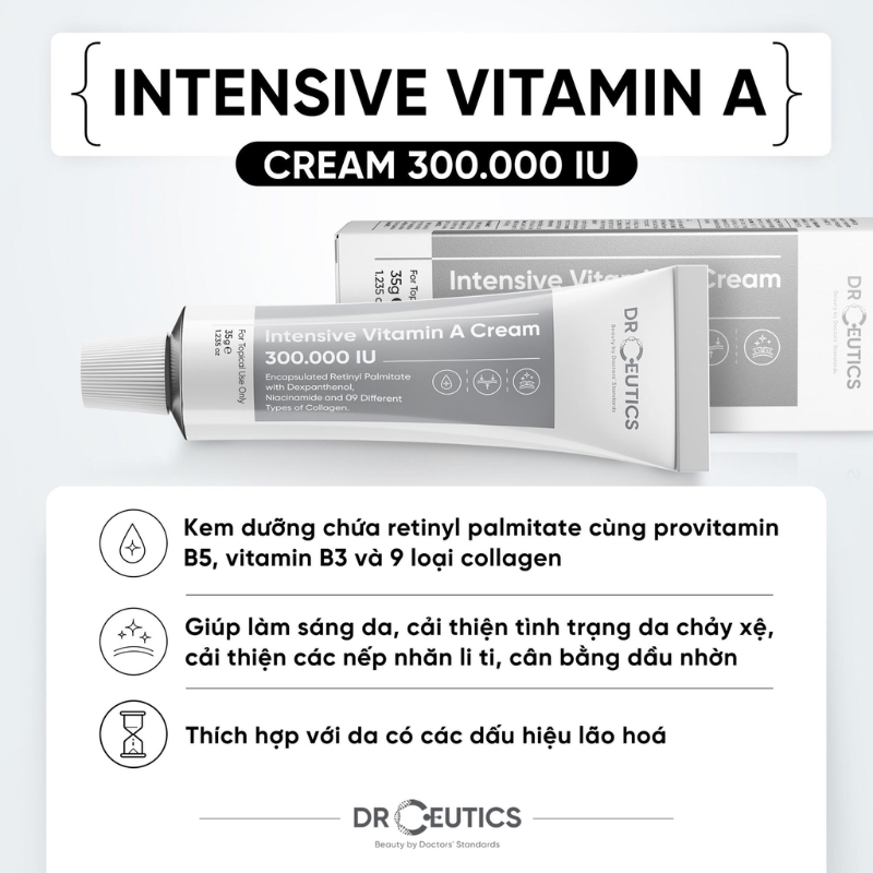 Kem Dưỡng DrCeutics Intensive Vitamin A Cream 300.000 IU Làm Sáng Da có chứa hoạt chất Retinyl Palmitate là dẫn xuất của Vitamin A với nồng độ cao (300,000 IU) giúp tăng tốc độ thay đổi tế bào trên bề mặt da, hoạt động như một thành phần tẩy tế bào chết trên da, giúp làn da có kết cấu mịn màng và đều màu, chống oxy hoá và ngăn ngừa lão hoá.