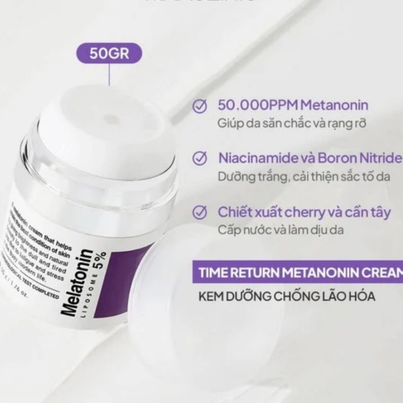 - Kem Dưỡng Mờ Nám, Chống Lão Hóa Melatonin Liposome 5% Maxclinic Time Return Cream chứa Melatonin tương tự như Melatonin do cơ thể sản xuất, giúp da săn chắc và rạng rỡ hơn.