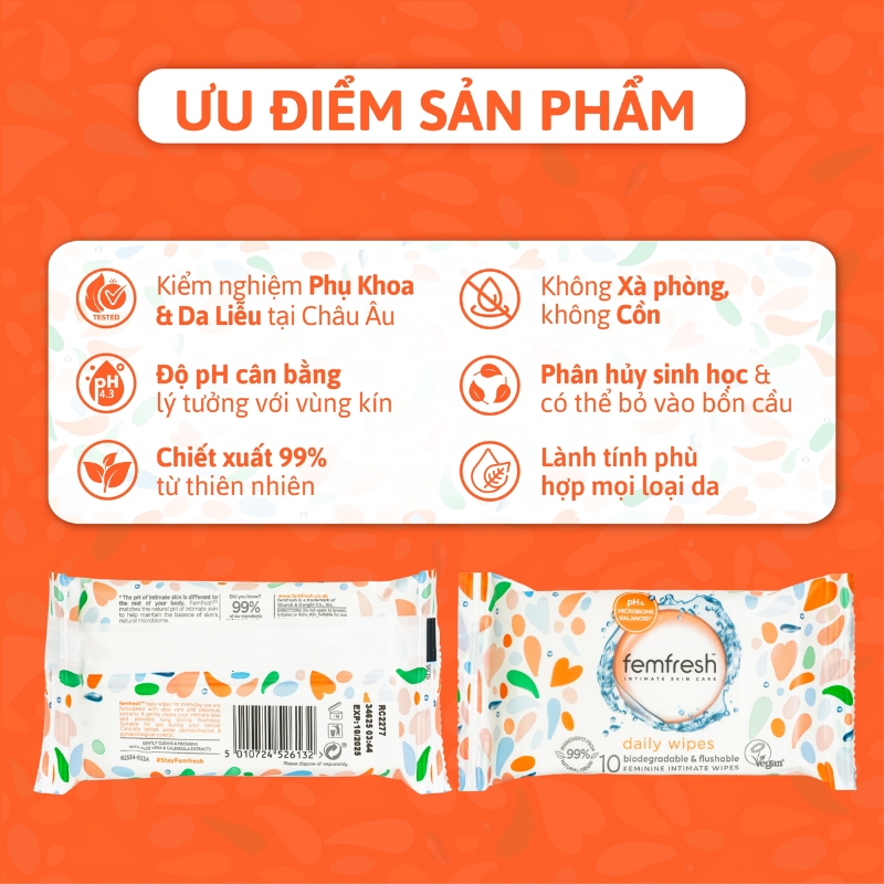 Khăn ướt vệ sinh vùng kín hằng ngày cao cấp Femfresh Intimate Skin Care Daily Wipes là sản phẩm vệ sinh chuyên dụng hàng ngày dành cho vùng kín giúp làm sạch, khử mùi hôi, hỗ trợ kháng khuẩn, kháng viêm đồng thời nuôi dưỡng làn da vùng kín,…