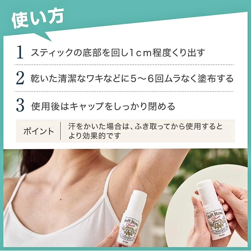 Không chỉ dùng cho lăn và khử mùi nách, Lăn khử mùi Soft Stone còn có thể sử dụng trên các vùng da cơ thể khác như khuỷu tay, khuỷu chân. Bất cứ vùng da nào có “mùi cơ thể” khó chịu, bạn đều có thể thoa Soft Stone để thấy rằng từ nay mùi cơ thể không còn là nỗi lo ngại đối với bạn nữa