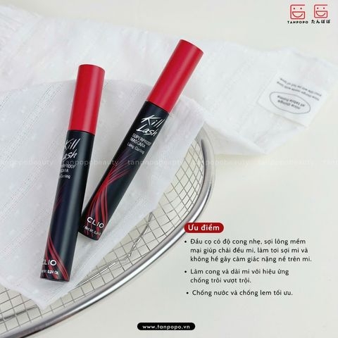 Mascara Clio Kill Lash Superproof Dài Và Cong Mi 7g - 01 Long Curling giúp hàng mi cong vút, dày và sắc nét suốt cả ngày nhờ công thức Superproof chống nước, chống mồ hôi vượt trội. Đầu cọ mảnh dễ chạm đến từng sợi mi, kể cả mi ngắn và khó chải, giúp tách mi đều, không vón cục. Kết cấu nhẹ, bám tốt nhưng dễ tẩy trang bằng sản phẩm chuyên dụng, giữ mi đẹp tự nhiên mà không gây nặng mắt.