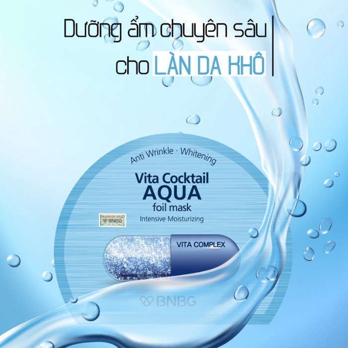 Mặt Nạ BNBG Vita Cocktail Aqua Foil Mask là chiếc mặt nạ có khả năng làm dịu, phục hồi làn da khô ráp, bong tróc, thiếu ẩm, hàng rào bảo vệ da hư tổn. Với công nghệ thiếc & công thức chứa HA đa phân tử giúp dưỡng chất thẩm thấu sâu vào da mang lại tác dụng giữ ẩm, cấp nước chuyên sâu, từ đó nuôi dưỡng làn da khỏe mạnh, tăng cường hàng rào bảo vệ da căng bóng, đầy sức sống.