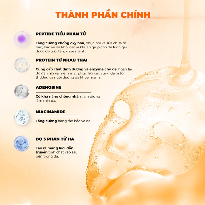 Dẫn truyền: Bằng cách sử dụng 3 loại phân tử HA khác nhau giúp tạo thành một mạng lưới dẫn truyền theo chiều sâu, đưa các dưỡng chất từ mặt nạ vào tận lớp trung bì, giúp cải thiện làn da từ sâu bên trong.