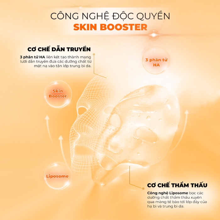 Công nghệ Skin Booster: Là công nghệ đặc biệt góp phần làm tăng hiệu quả hấp thụ dưỡng chất của mặt nạ cho da thông qua 2 cơ chế sau: