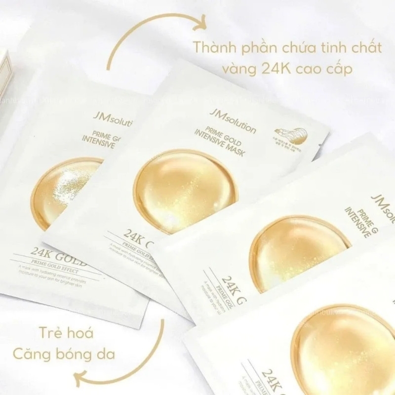 - Mặt Nạ Vàng JM Solution Prime Gold Premium Foil Mask dưỡng ẩm 3 lớp với thành phần vàng 24k dưỡng ẩm sâu, giúp da săn chắc và đàn hồi hơn, loại bỏ tình trạng căng, khô, bong tróc, giảm các dấu hiệu lão hoá, giảm thiểu nếp nhăn.