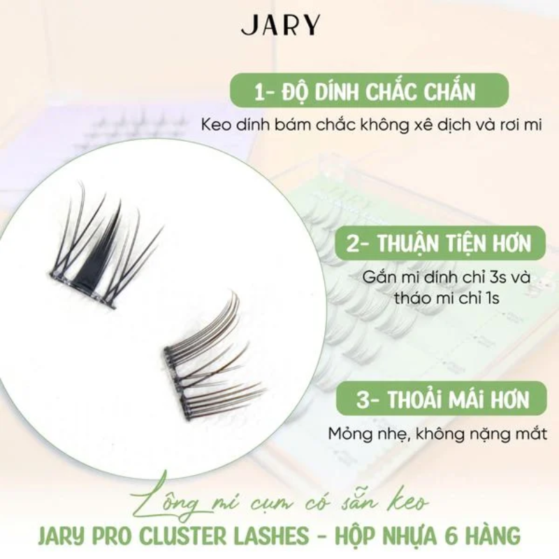 Lông mi cụm có sẵn keo Jary Pro Cluster Lashes sử dụng chất liệu cao cấp, lông mi đem đến hàng mi dày, dài và cong vút mà không làm nặng mắt.