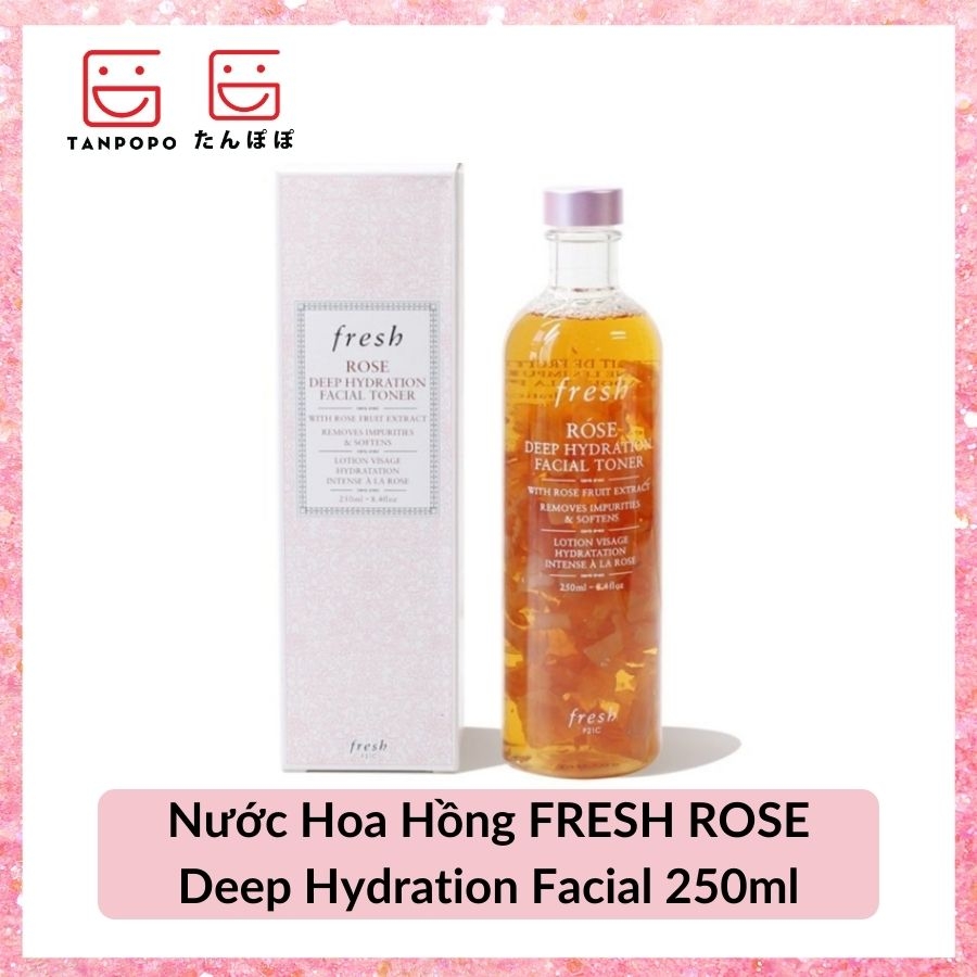 Nước Hoa Hồng FRESH ROSE Deep Hydration Facial 250ml giúp làm sạch da, nhẹ nhàng loại bỏ các bụi bẩn, tạp chất còn xót lại, thu nhỏ lỗ chân lông, giúp da khỏe mạnh, mềm mại. Có chứa hoa hồng & dầu hoa hồng giúp xoa dịu & nuôi dưỡng da.