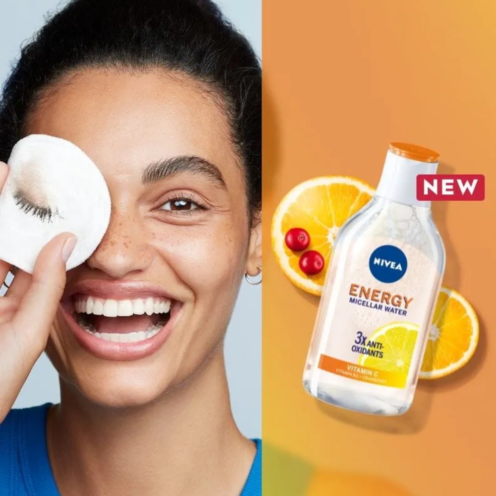 Nước Tẩy Trang Dưỡng Sáng & Chống Oxy Hóa Nivea Energy Micellar Water 400ml giúp làm sạch sâu và loại bỏ lớp trang điểm đồng thời mang lại làn da rạng rỡ. Công thức chống oxy hóa gấp 3 lần với Vitamin C, Niacinamide và chiết xuất quả nam việt quất giúp cung cấp năng lượng và phục hồi làn da của bạn, để lại một làn da mềm mại và tươi mới tuyệt vời.