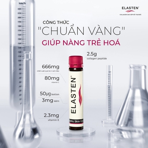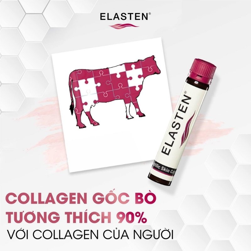 Nước Uống Bổ Sung Collagen Elasten là sản phẩm hỗ trợ làm đẹp đến từ thương hiệu Elasten - Đức, với công thức [HC] Collagen Complex đột phá, độc quyền, collagen trong ELASTEN được thủy phân thành các phân tử collagen peptide cực nhỏ giúp quá trình hấp thụ vào cơ thể tối ưu, mang lại hiệu quả nhanh hơn collagen thông thường. Đặc biệt collagen gốc bò tương thích tới 90% cấu trúc collagen tự nhiên của con người, phù hợp bổ sung lượng collagen bị thiếu hụt và tăng cường hiệu quả trẻ hóa trên da.