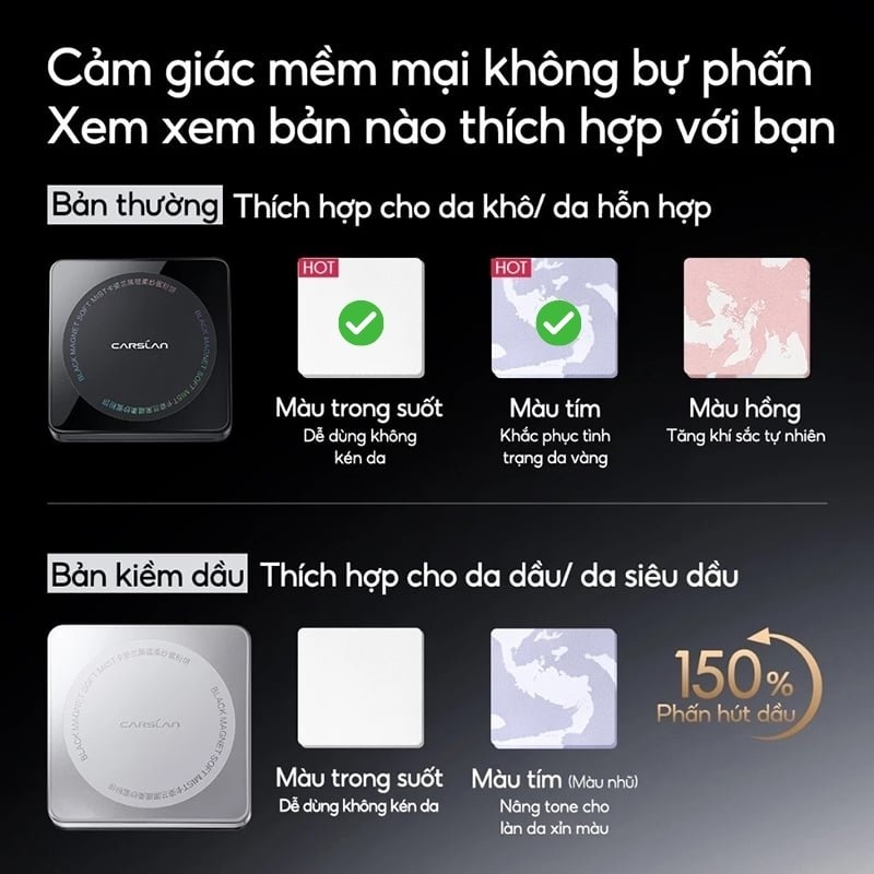 - Công nghệ "kiểm soát dầu từ tính" độc quyền của Carlan đã được chứng nhận có thẩm quyền của SGS. Có lực hút mạnh giống như nam châm có thể hút đi lớp dầu thừa do lớp trang điểm trên da tiết ra. Mà không hấp thụ dầu dưỡng ẩm từ dưới da, giúp bảo vệ lớp nền trang điểm mịn mượt mà không bị khô.