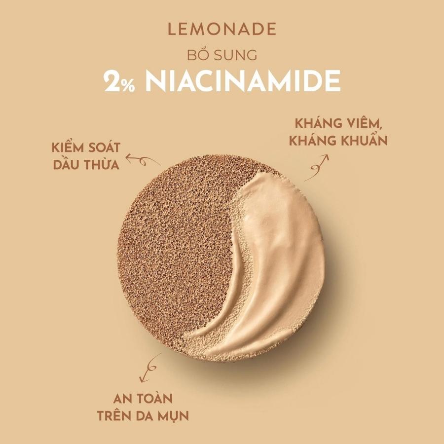 - Đăc biệt ít khi có một loại cushion nào được bổ sung đến 2% Niacinamide giúp làm dịu da, giảm sưng tấy mụn, kháng viêm kháng khuẩn cho da, hạn chế phát sinh mụn và hỗ trợ điều tiết độ ẩm trên da.