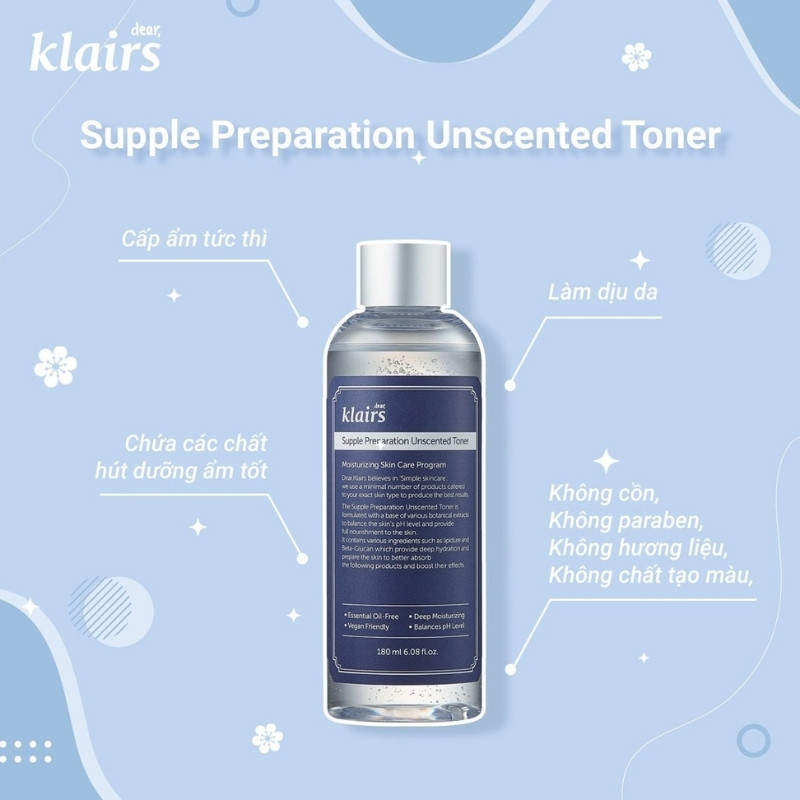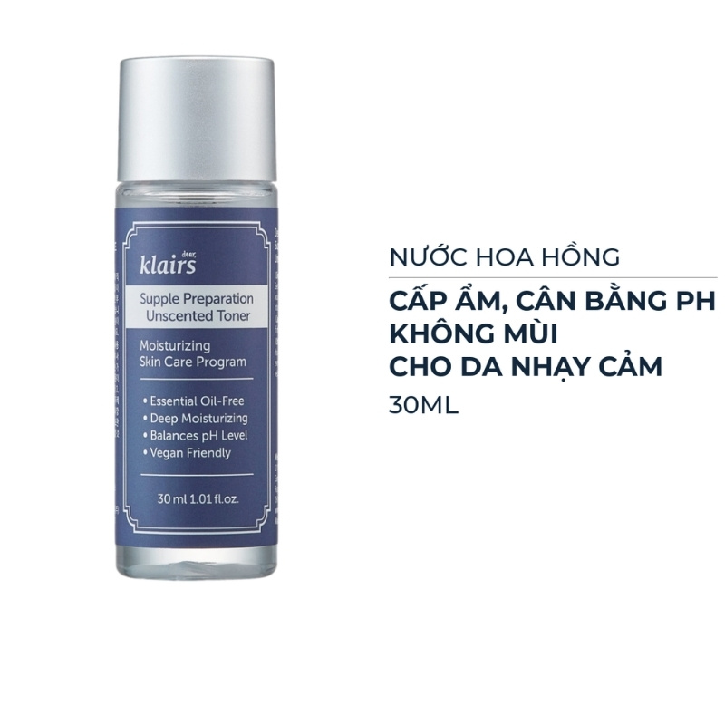 Nước Hoa Hồng Klairs Không Mùi Cho Da Nhạy Cảm Supple Preparation Unscented 30ml là nước hoa hồng giúp làm sạch bụi bẩn và bã nhờn dư thừa bằng các axit amin và các thành phần chiết xuất như rễ cam thảo và lô hội để làm dịu kích ứng. Đặc biệt không chứa các thành phần tinh dầu và không mùi hương nhẹ dịu hơn cho người không thích mùi hương thuộc thương hiệu Klairs đến từ Hàn Quốc.