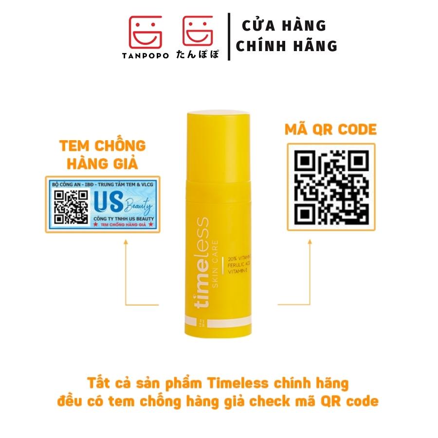 Tinh chất thần thánh giúp cho việc làm trắng da cũng như trị thâm mụn mà suốt thời gian qua người ta không ngừng nhắc đến nó – đó chính là Vitamin C. Khi được hỏi tới những loại serum trị mụn, sáng da mà giảm thâm hiệu quả nhất thì Timeless 20% Vitamin C + E Ferulic Acid Serum sẽ không thể vắng mặt trong những Top List của nhiều cửa hàng mỹ phẩm, hay website về làm đẹp uy tín.