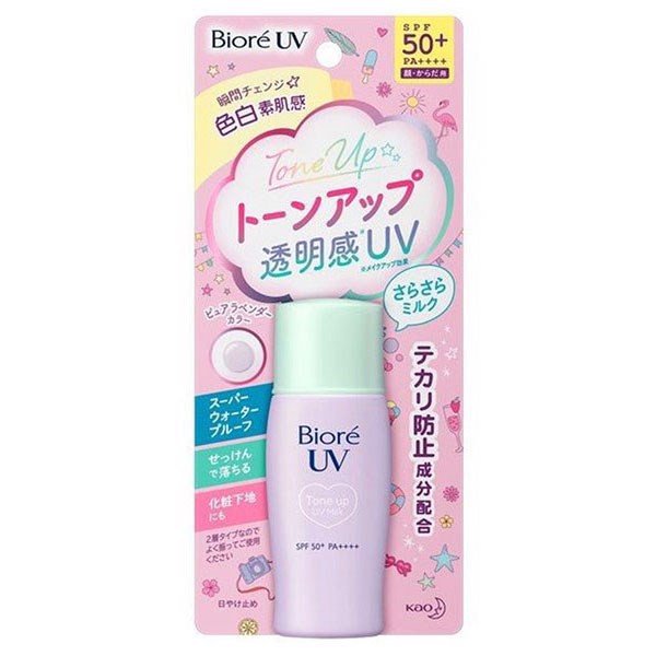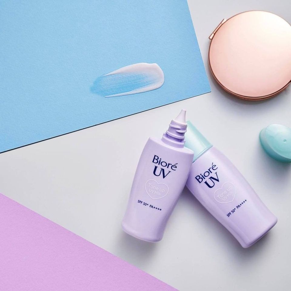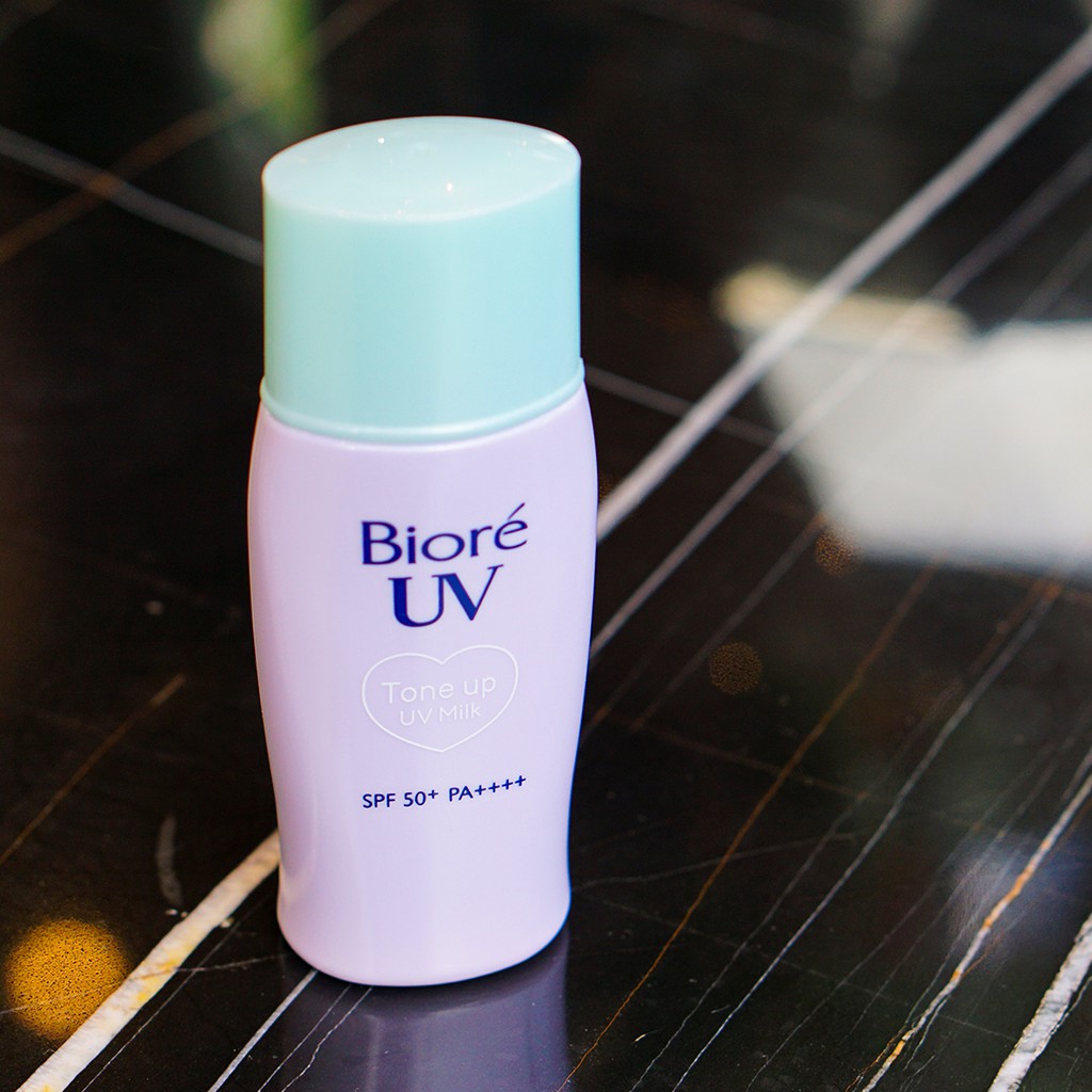Sữa chống nắng Biore Tone Up UV Milk SPF50 30ml sử dụng ánh tím Lavender cùng bột phấn Prism giúp hiệu chỉnh màu da độc đáo, nâng tông da sáng và đều màu tự nhiên nên có sử dụng như lớp lót trang điểm hằng ngày.