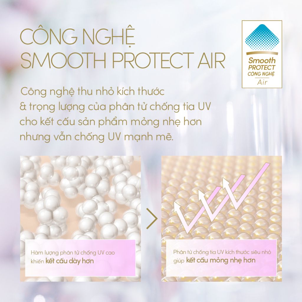 - Công Nghệ Smooth Protect Air giúp thu nhỏ kích thước & trọng lượng của các phân tử chống tia UV thành kích thước nano siêu nhỏ, cho mỏng nhẹ hơn, giảm tối đa tình trạng bết dính, hạn chế áp lực lên làn da nhạy cảm nhưng vẫn đảm bảo khả năng chống tia UVA/B và bụi ô nhiễm thật ưu việt!