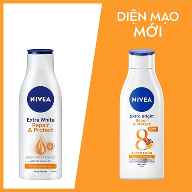 Sữa Dưỡng Thể Nivea Giúp Phục Hồi & Chống Nắng Extra Bright Repair & Protect SPF30 (Vàng) với công thức chứa các hạt phân tử siêu nhỏ thấm nhanh hơn vào da, mang đến cho bạn một làn da trắng mượt mịn màng. Sản phẩm còn có chỉ số chống nắng SPF50 bảo vệ tối ưu làn da trước nắng đồng thời phục hồi làn da đã bị hư tổn do nắng, mang lại vẻ tự tin với làn da trắng mịn đầy sức sống.