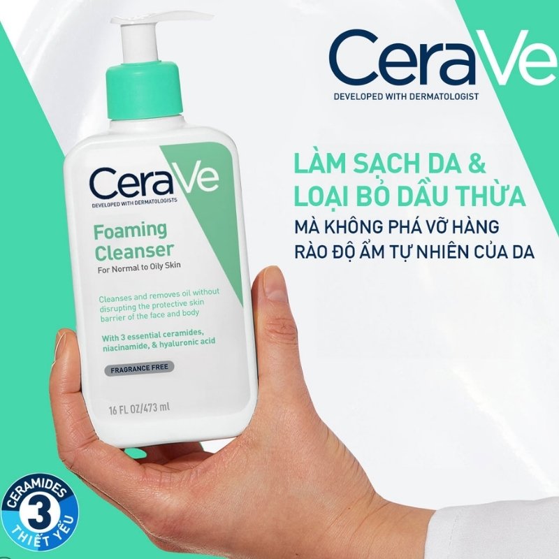 Sữa Rửa Mặt Cerave Sạch Sâu Cho Da Thường, Da Dầu Foaming Cleanse kết cấu dạng gel tạo bọt rất lý tưởng để loại bỏ dầu thừa, bụi bẩn và lớp trang điểm với công thức nhẹ nhàng, không phá vỡ hàng rào bảo vệ tự nhiên của da và chứa các thành phần giúp duy trì độ ẩm cân bằng da. Cerave Foaming Cleanser chứa Ceramides, Axit Hyaluronic và Niacinamide giúp duy trì hàng rào bảo vệ da, khóa ẩm và làm dịu làn da của bạn