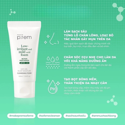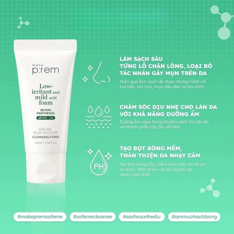Sữa Rửa Mặt Make P:rem Safe Me Relief Moisture Cleansing Foam 100ml là sữa rửa mặt nổi bật với công thức dịu nhẹ, độ pH cân bằng, giúp làm sạch da mà không gây khô căng, đặc biệt phù hợp cho da nhạy cảm.