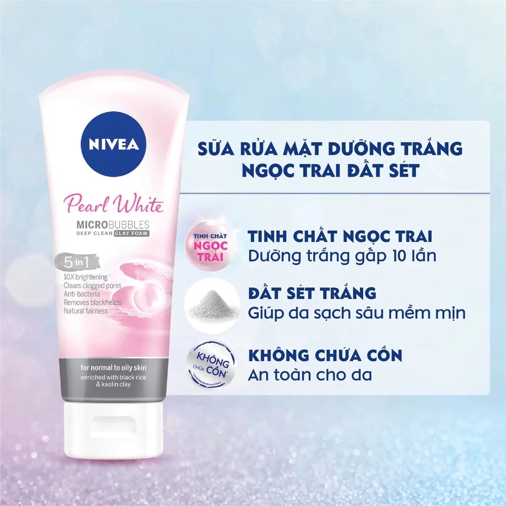Sữa Rửa Mặt Nivea Đất Sét Ngọc Trai Làm Sáng Da Pearl White Micro Bubbles Deep Clean Clay Foam 5IN1 chứa thành phần đất sét trắng Kaolin giúp làm sạch sâu lỗ chân lông và loại bỏ bã nhờn, cùng tinh chất Pearly White dưỡng sáng & làm đều màu da. Sản phẩm ứng dụng công nghệ bọt siêu nhỏ giúp giảm thiểu ma sát trên da mà vẫn đảm bảo hiệu quả làm sạch, an toàn và dịu nhẹ cho mọi loại da.