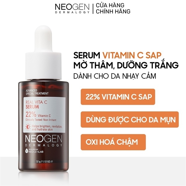 - Tinh Chất Neogen Dermalogy Mờ Thâm, Sáng Da Real Vita C Serum 22% + 5% 32g (Mẫu Mới) với 22% Vitamin C và 5% Niacinamide giúp giải quyết các vấn đề về da như làm sáng, săn chắc da, dưỡng ẩm, chống lão hóa, an toàn và dịu nhẹ không gây kích ứng da mang lại cho bạn một làm da khỏe mạnh