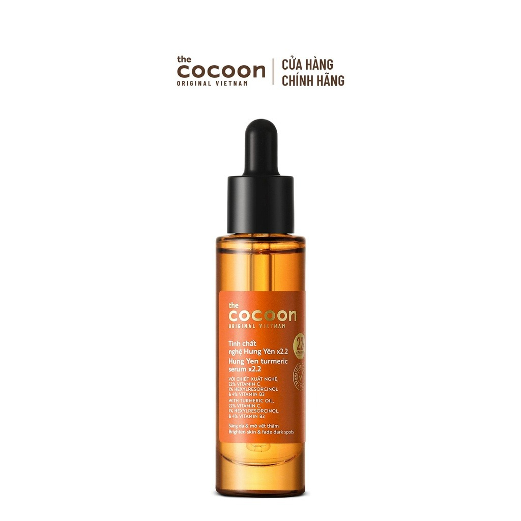 Tinh Chất Cocoon Nghệ Hưng Yên x2.2 Sáng Da Chuyên Sâu 30ml là sản phẩm tinh chất đến từ thương hiệu mỹ phẩm Cocoon của Việt Nam, vận dụng nguồn năng lượng dồi dào từ củ nghệ Hưng Yên và các thành phần hoạt tính nổi bật gồm 22% Vitamin C, 1% Hexylresorcinol, 4% Niacinamide và 2% NAG giúp làm sáng các làn da ngăm đen, tối màu, cháy nắng, có tác dụng tốt trên vết thâm đậm và vết thâm đỏ do mụn để lại, chống oxy hóa giúp ngăn ngừa lão hoá da, cải thiện bề mặt giúp da trở nên mịn màng, căng bóng.