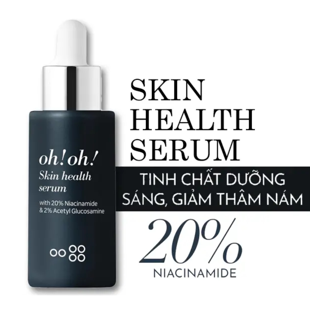 Tinh Chất Oh!Oh! Dưỡng Sáng Da Giảm Thâm Nám Skin Health 10ml chứa nồng độ 20% Niacinamide (vitamin B3) giúp làm sáng da, giảm mụn, hỗ trợ điều tiết dầu thừa, ngừa bít tắc chân lông. Kết hợp cùng 2% N- Acetyl- Glucosamine (NAG) hỗ trợ cải thiện đốm sắc tố, giúp da sáng hơn, đều màu hơn, ngoài ra còn có công dụng làm giảm mụn. Serum thấm nhanh, không nhờn dính như các sản phẩm serum Niacinamide khác trên thị trường, lý tưởng dành cho làn da dầu mụn.