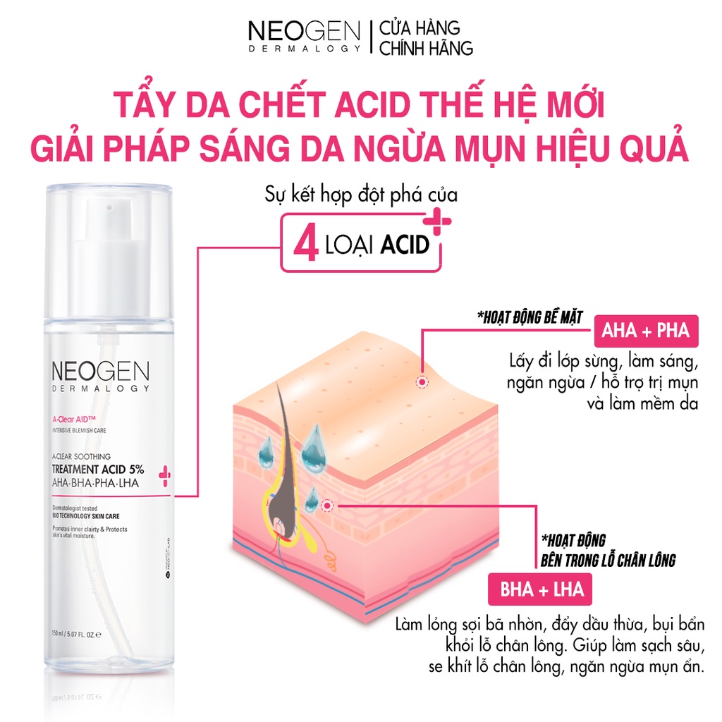 - Hoạt chất tẩy da chết thế hệ mới PHA và LHA giúp làm sạch lớp sừng già cỗi cho da sáng mịn mà không làm kích ứng da