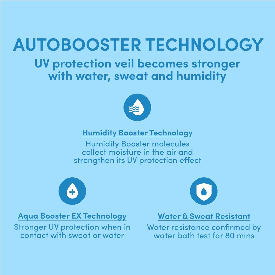 Công nghệ Auto Booster mới giúp màng chống UV trở nên bền vững khi tiếp xúc ĐỘ ẨM-MỒ HÔI-NƯỚC & CHỐNG TRÔI DO MA SÁT. Chống trôi trong nước đến 80' nhờ công nghệ Very Water Resistant đồng thời chống bụi mịn PM2.5 và chống dính cát.