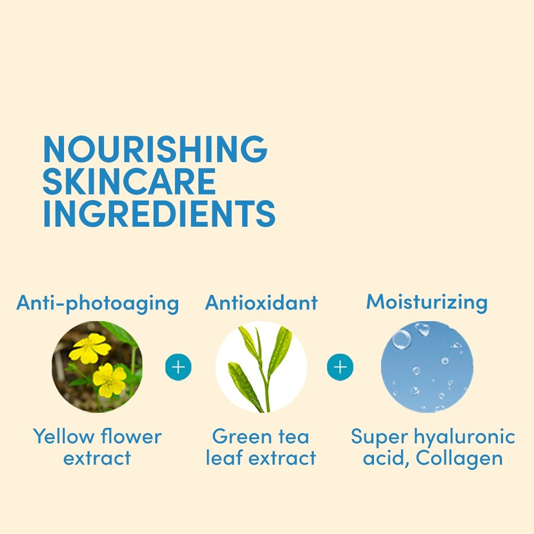 Công thức bổ sung 50% thành phần dưỡng da bao gồm: Super HA, Collagen, Glycerin (giúp giữ ẩm nâng cơ), Rễ Hoa Hồng Vàng (chống giãn mao mạch), Chiết Xuất Trà Xanh Uji Kyoto (chống oxy hóa), Rễ Cam Thảo (kháng viêm, ngừa mụn) giúp ngăn ngừa lão hóa sớm do tác động của tia UV & dưỡng da mịn mượt.