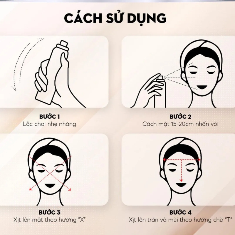 Nhắm mắt và miệng, nhẹ nhàng xịt lên khuôn mặt, đảm bảo sản phẩm phủ đều mọi ngóc ngách trên da.